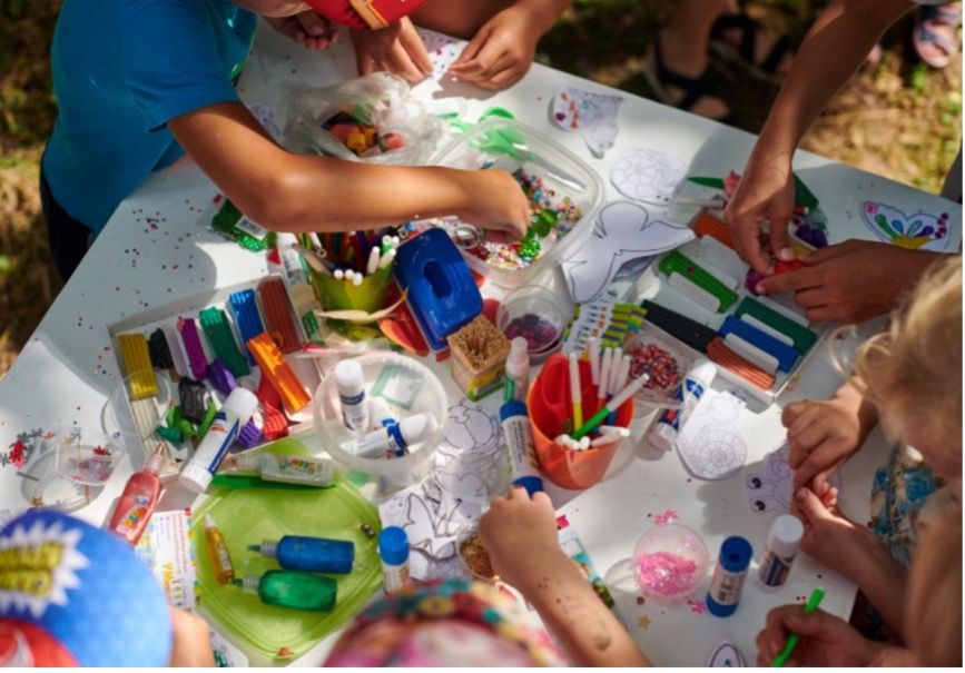 Kinderen gaan samen met de pedagogisch medewerkers wat eten en drinken en gaan dan naar buiten
